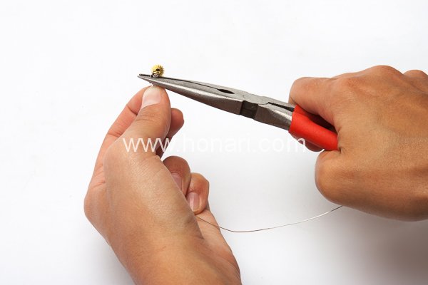 ابتدا یک سر سیم مفتول یا نخ نایلونی را از داخل یکی از خرج کار ها و قلاب بند عینک رد کنید سپس دوباره سیم مفتول یا نخ نایلونی را از داخل یک شکل حلقه مانند از داخل سیم رد کنید. سیم یا نخ نایلونی را بکشید تا قلاب بند عینک و خرج کارتان سر جایشان ثابت شوند. سر خرج کار را با انبر سفت کنید.