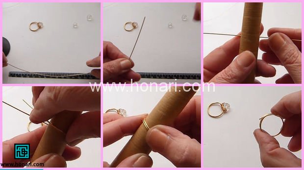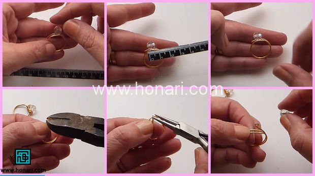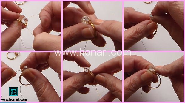 اکنون زمان قراردادن کریستال یا سنگ در مکان اصلی خود می باشد. برای این کار از سیم نازک تر، 40 سانتی متر سیم را برش دهید. این سیم را بر روی بدنه حلقه و قبل از گردی های ایجاد کرده سه مرتبه به صورت چرخشی بپیچید.