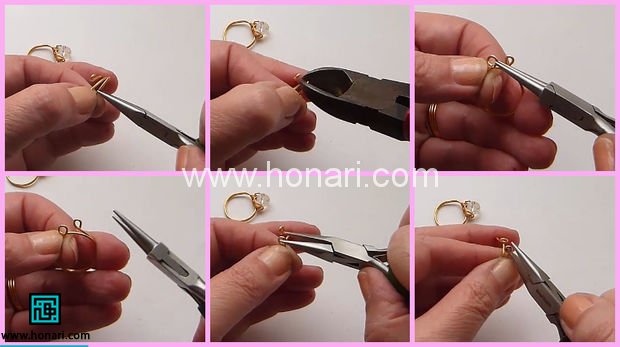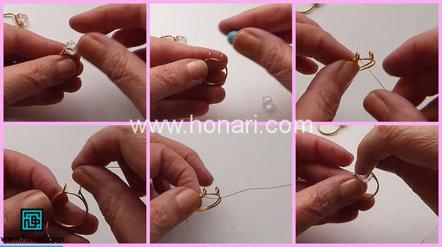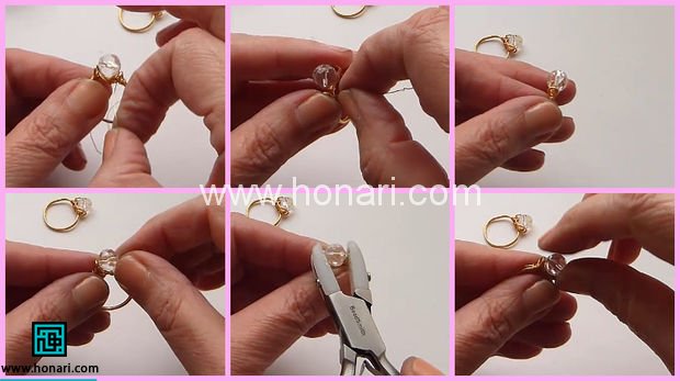 با همان سیم نازکی که به دور حلقه پیچ دادید باید ادامه کار را پیش ببرید. سیم را از داخل حلقه ای که توسط دمباریک ایجاد کردید رد کرده و سپس کریستال را از آن عبور دهید.