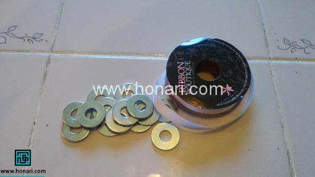 وقتی که روبان را به اندازه ی دلخواه برش زدید، می توانید رد کردن واشر ها را شروع کنید.