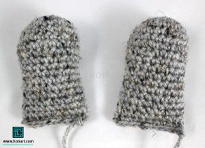 داخل دست ها را با الیاف پر کرده و سپس لبه های هر دست را به هم می دوزیم نخ اضافه را جدا نمی کنیم.