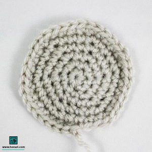رج3: ( پایه کوتاه+ دو پایه کوتاه در یک زنجیره) تا اخر رج(18 پایه داریم) با بخیه نامرئی به پایه اول متصل کنید