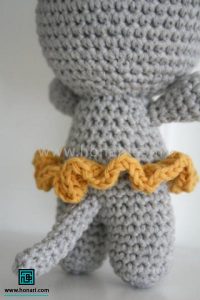 و برای دامن قلاب بافی فقط در رج 15 با یک رنگ دیگر از پشت پایه ها پایه کوتاه بزنید.