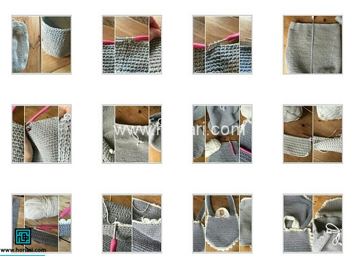 پایه کوتاه را برای این میبافیم که در قسمت ته کیف فاصله نباشد. به این ترتیب حتی اگر آستر هم ندوختیم وسایل از ته کیف ما بیرون نمیریزند.