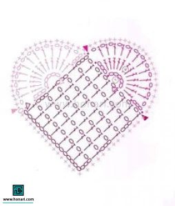 گوشه های قلب: بر روی ضلعی که رج آخر را بافتید و کور کردید. روی زنجیره فاصله چهارم 5 زنجیره زده و بصورت حلقه بر روی زنجیره فاصله پنجم بست می زنید در ادامه سه زنجیره زده و در حلقه ایجاد شده 12 پایه بلند می زنید.