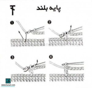 آخرین حلقه زنجیر در قلاب می باشد. همانطور که در عکس مشخص می باشد برای اولین بافت پایه بلند باید 1 دور از نخ رو دور قلاب بپیچیم و از زنجیر چهارم رد کنیم.
