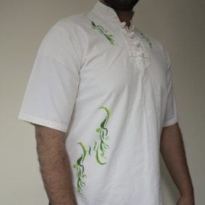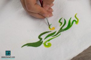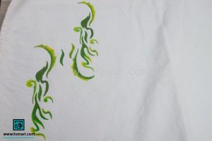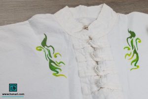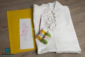 1- وسایل مورد نیاز برای شروع.پیراهن–کاربن-طرح-رنگ سبز و زرد – قلم مو پارس آرت