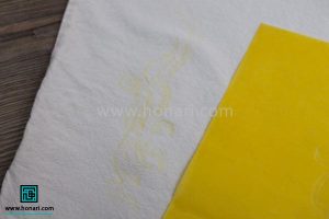 3- پس از انتقال طرح بر روی پارچه با استفاده از رنگ زرد شروع به نقاشی کنید.رنگ زرد را فقط در قسمتهایی که میخواهید روشن باشد رنگ آمیزی کنید.