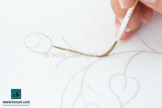 رنگ برنزی رو با کمی آب رقیق می کنیم و با قلم موی شماره 2 خطوط نازک شاخه ها و خطوط گل ها و برگ ها رو رنگ آمیزی می کنیم.