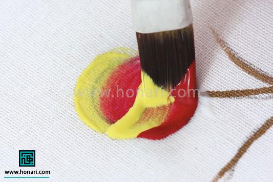 بعد، دو طرف قلم موی شماره 12 رو به رنگ های زرد لیمویی و شرابی آغشته می کنیم