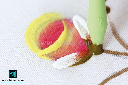 با همون رنگ های مرحله قبل و این دفه با حرکت نیم دایره ای رو به پایین، قسمت پایین گل رو رنگ آمیزی می کنیم.