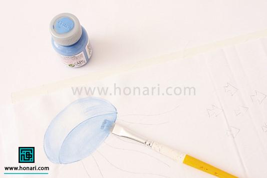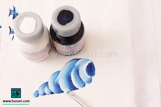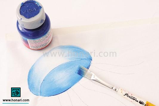 در این مرحله از نقاشی روی پارچه باز هم با همون قلم مو و این بار با رنگ آبی آسمانی همان کار مرحله قبل رو تکرار می کنیم تا به یک رنگ ترکیبی جدید برسیم.