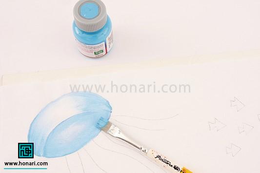 با استفاده از همون قلم مو و رنگ آبی کارائیبی قسمت بالای عروس دریایی رو با حرکت قلم مو از گوشه ها به سمت مرکز به شکلی که مرکز تقریبا سفید بمونه، رنگ آمیزی می کنیم.