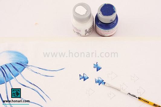 نوک قلم موی سرتخت شمار 2 رو به آبی کبالت آغشته می کنیم و تمام بدن ماهی ها رو رنگ می کنیم.