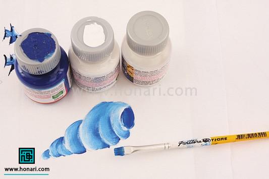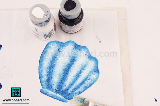 نوک قلم موی سرتخت شماره 14 را به آبی تیره آغشته می کنیم و بر سطح تیره صدف دریایی با نوک قلم مو ضربه می زنیم تا بافت ایجاد بشه.