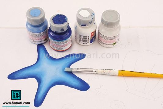 قلم موی شماره 4 را به رنگ آبی تیره آغشته می کنیم و تمام سطح بزرگترین ستاره دریایی رو با ضربه های گرد کوچک می پوشونیم.