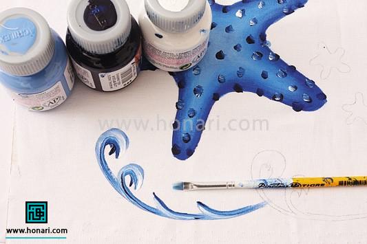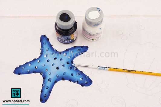 نوک قلم مو شماره 14 رو به آبی تیره آغشته می کنیم و بر سطح تیره ستاره دریایی با نوک قلم مو ضربه می زنیم تا بافت ایجاد بشه.