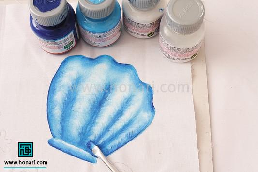 با همین قلم مو و رنگ آبی آسمانی قسمت انتهایی و خطوط تقسیمی صدف رو با حرکات خارج به داخل قلم مو، نقاشی می کنیم.