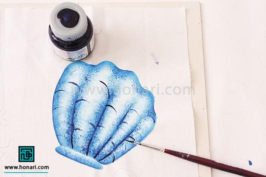 با نوک قلم موی شماره 0 و رنگ آبی تیره خطوط تقسیم کننده سطح صدف رو با حرکت از سمت انتها سایه دار می کنیم.