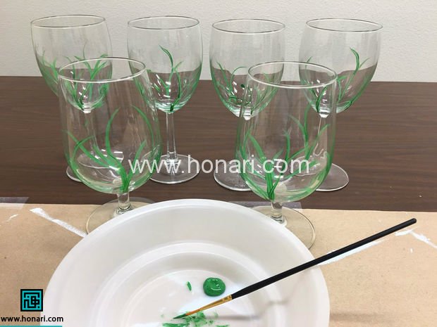 بعد از این که این عمل را به خوبی انجام دادید، با استفاده از یک قلم موی باریک، ساقه ها را ترسیم کنید. برای این کار قلم مو را در رنگ سبز فرو کنید و از پایین شیشه شروع به کشیدن کنید، رنگ را به سمت بالا برده و به آرامی کشیدن را تمام کنید. به همین راحتی یک ساقه کشیدید.