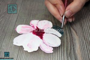 بتدا رنگ ویترای صورتی را با احتیاط در وسط گل می ذاریم و به سمت گلبرگ ها هدایت می کنیم،بعدش با رنگ سفید روی گلبرگ ها رو می پوشونیم.