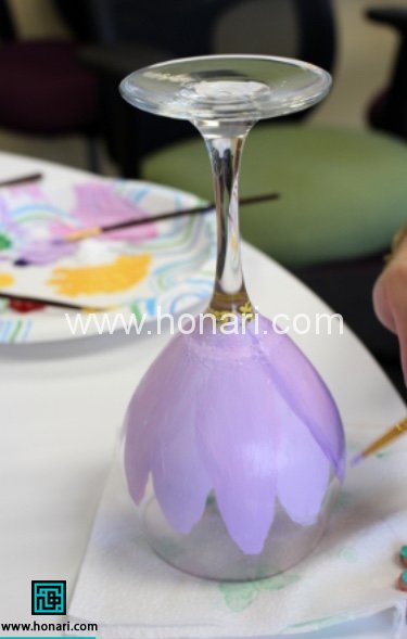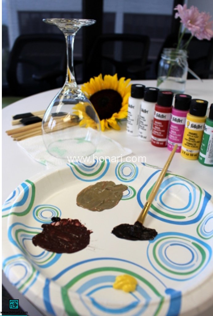 مقدار کمی از هر رنگ روی پالت بریزید.مطمئن شید که رنگ های لازم برای گلبرگ ها،ساقه و مرکز گل رو دارید.حالا که پالت رنگ آماده شد جام رو به صورت برعکس روی دستمال یا حوله یا روزنامه قرار بدید(برای تمیز کردن قلم مو ها هم به دستمال نیاز خواهید داشت)