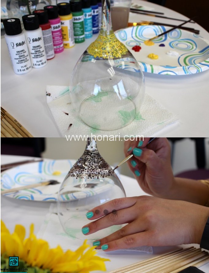 در قسمتی که پایه ی جام به بدنه ش متصل شده با استفاده از قلم موی کوچیک نقطه هایی بگذارید که ریز یا درشت بودنشون بستگی به گلی داره که میخواید بکشید
