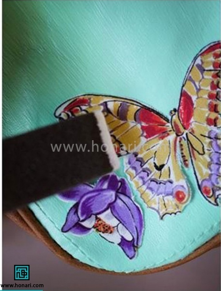 بوسیله قلمو کل سطح مورد نظر را یکسان چسب میزنیم و با قلمو از ایجاد حباب در زیر دستمال جلوگیری میکنیم.دقت کنید که این کار باید آهسته انجام شود تا از پاره شدن دستمال جلوگیری شود.