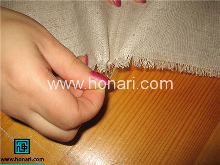 حدود یک سانت از هر طرف را باید ریشه بزنید. برای این کار فقط کافی است تا گونی را نخ کش کنید. نخ کش کردن به این معناست که نخ گونی را گرفته و بکشید. بدین ترتیب کار شما دیگر ریش ریش نمی شود.