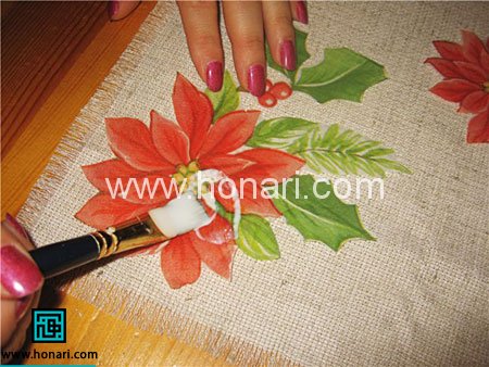 از یک قلموی نرم و تمیز استفاده کنید. چسب چوب را کمی با آب رقیق کرده و برای چسباندن طرح ها مورد استفاده قرار دهید. قلمو را درون چسب زده و به آرامی بر روی طرح بکشید.