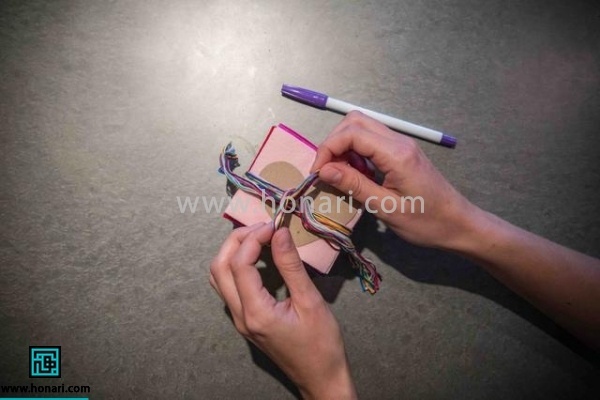 با کمک نخ و سوزن از بین درز قلب دوخته شده رد کنین. طول این نخ رو به اندازه ریسه مورد نظرتون، بگیرین.