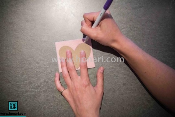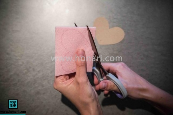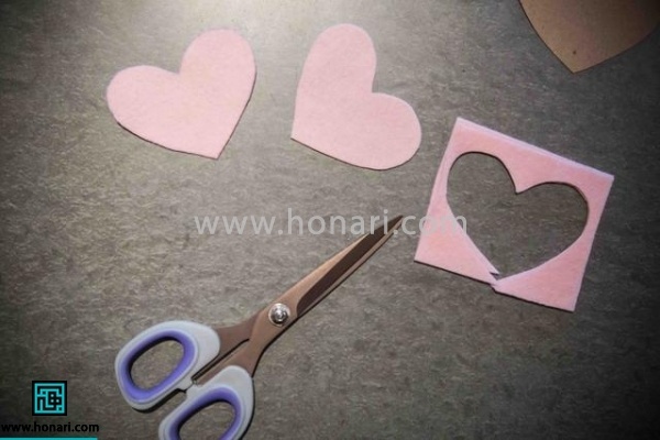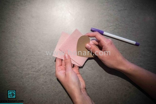 الگو قلب تونو روی پارچه نمدی قرار بدین و اونو با ماژیک یا مداد خیاطی صابونی، روی پارچه منتقل کنین.