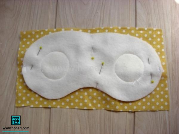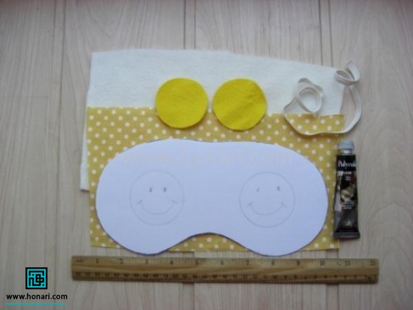قسمت جلوی چشم بند را روی پارچه ی نمد ی سفید برش میزنیم و دایره های زرد را مانند تصویر در جای خود قرار میدهیم