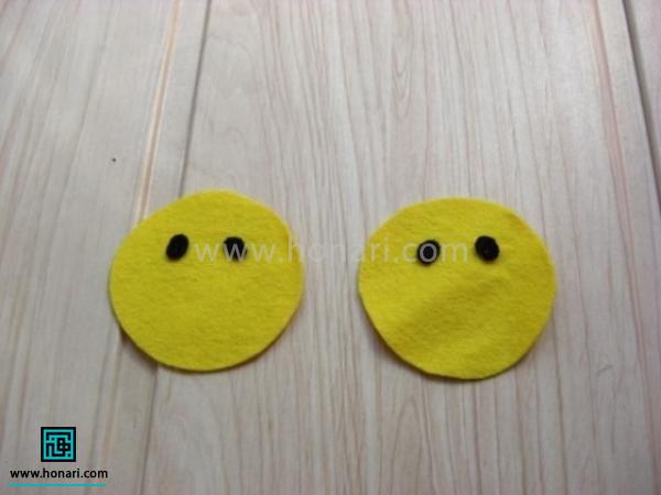 سپس 2 دایره از روی پارچه ی نمدی زرد میچینیم برای صورت و 2 دایره از روی پارچه ی نمدی مشکی برای چشم ها برش میزنیم .