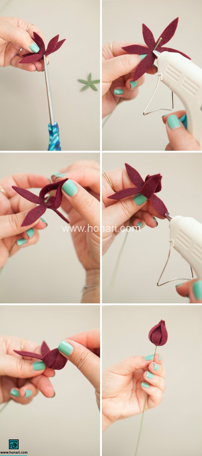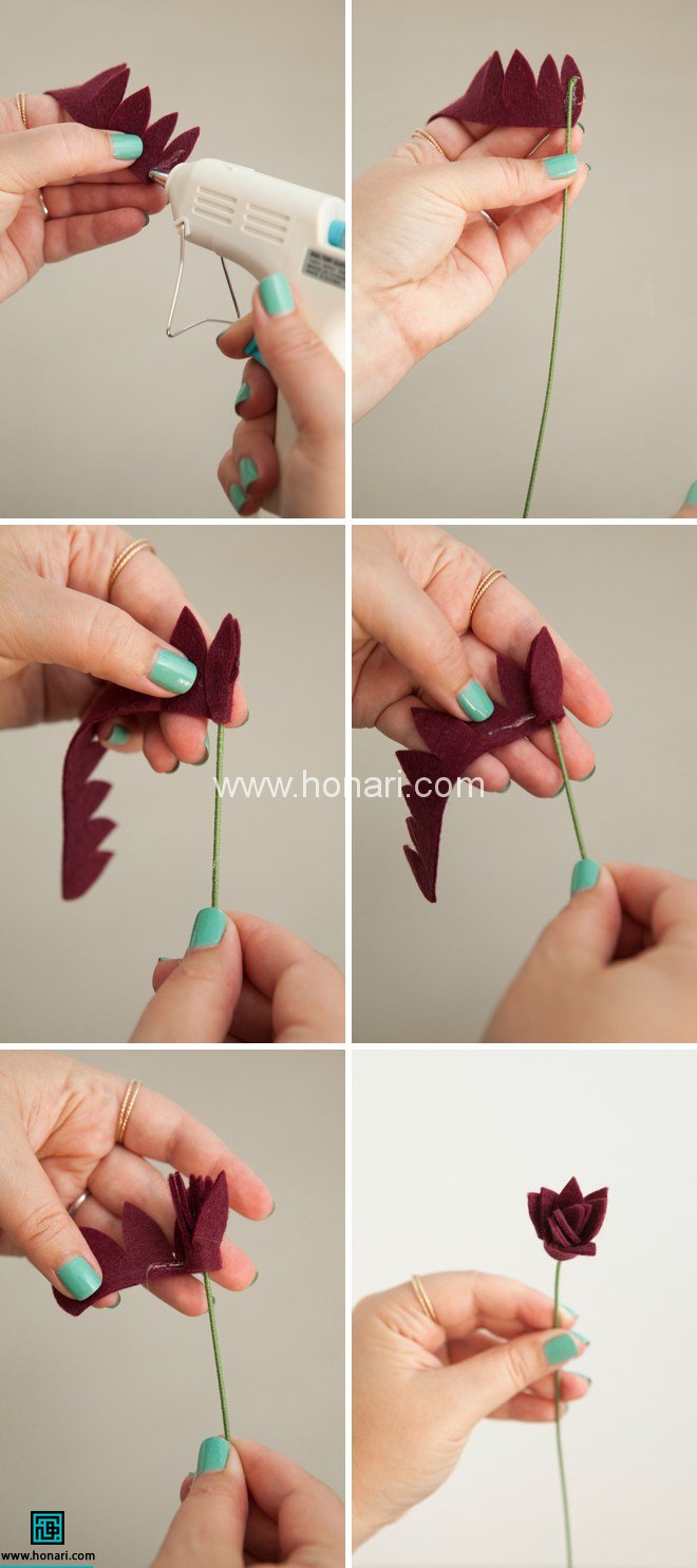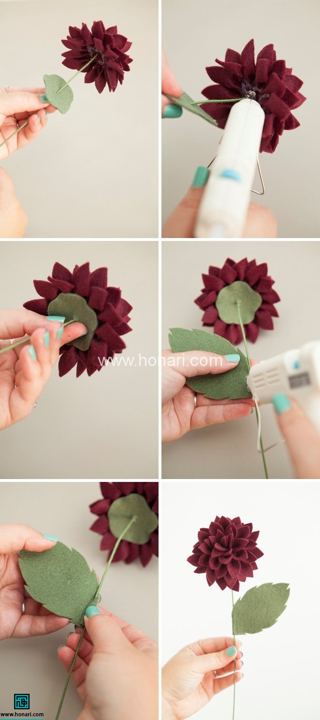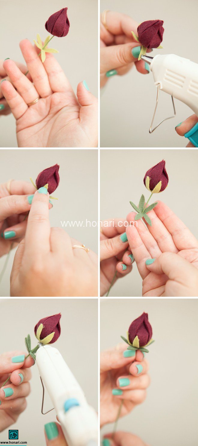 وسط قطعه ی نمدی سبز رنگ دایره شكل رو با سوزن سواخ كنید سپس اون رو وارد مفتول كنید و به پشت گل بچسبونید.سپس برگ رو به شاخه ی گل بچسبونید