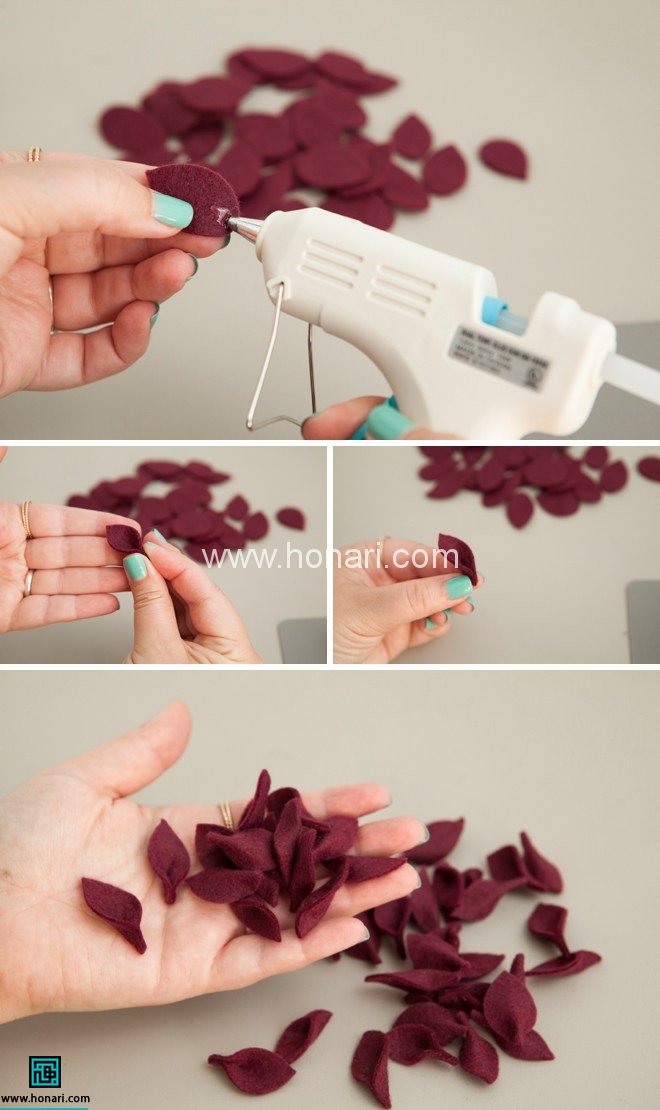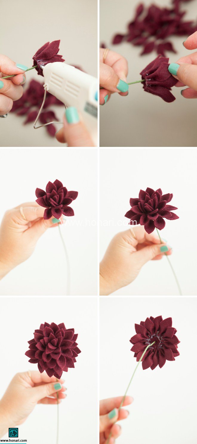 قسمت ستاره شكل پارچه نمدی زرشكی رو وارد مفتول كنید.سپس گلبرگ ها رو جمع كنید و به هم بچسبونید