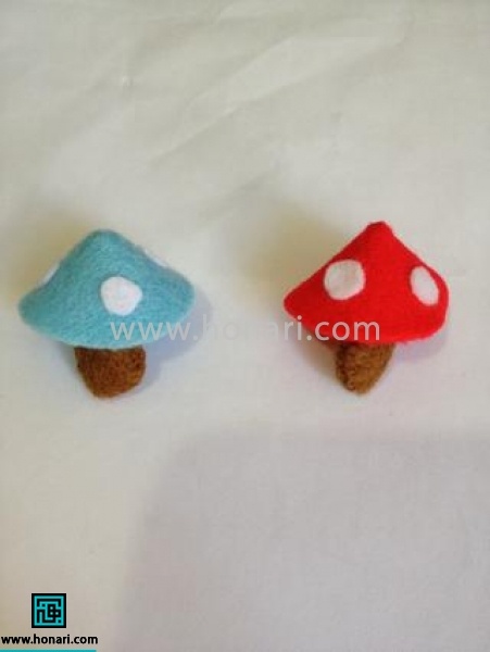 شکلهای سه چهارم دایره برش خورده آبی و قرمز رو از قسمت برش، روی هم میچسبونیم تا به شکل قیف در بیان. این قیف قراره کلاهک قارچ ما باشه. بعد دایرههای سفید را روی کلاهک میچسبونیم و کلاهک را به پایه قارچ نمدی مون میدوزیم.