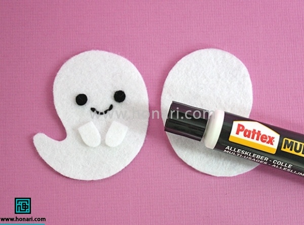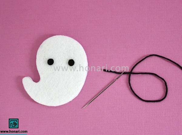 اول از همه الگوی روح رو با مداد خیاطی صابونی روی نمد سفید رنگ بکشین و اونو برش بزنین، بعد با استفاده از نمد مشکی، دو تا دایره کوچیک برای چشمهای روح نمدی تون در بیارین و اونارو با چسب حرارتی، بچسبونین.