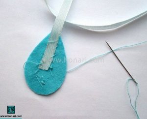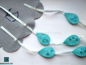 با استفاده از ربان باریک(نیم سانتی) حلقه درست میکنیم و به قسمت بالای ابر نمدی میدوزیم.