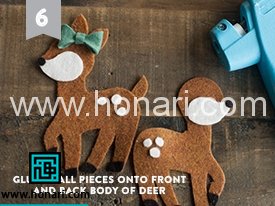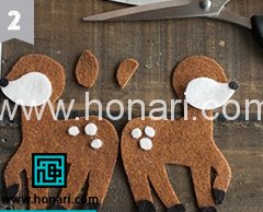 قطعات نمد قهوه ای و سفید و مشكی رو طبق شكل زیر جدا كنید . به این ترتیب شما چندین قطعه و از هر كدوم دو عدد به صورتی که كاملا به هم شبیه هستند دارید که بدن آهو را تشکیل می دهند . قسمت های سفید و مشكی مربوط به جزییات بدن آهو هستند . این قطعات را روی نمد قهوه ای که قبلا برش دادید ، با چسب حرارتی بچسبانید .