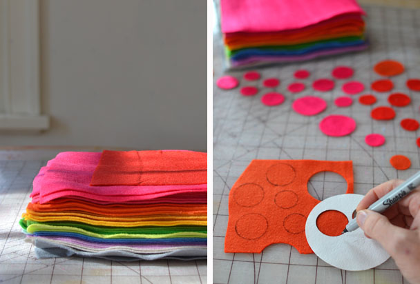 با قیچی یا کاتر دایره ها را از کاغذ خارج کنید ، حالا کاغذ را روی نمد با رنگ دلخواهتون بذارین و با ماژیک پاکشونده آن را بکشید .