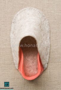 ِیکی از قسمت های پشت کفش نمدی را با استفاده از سوزن مانند شکل به کف متصل میکنیم