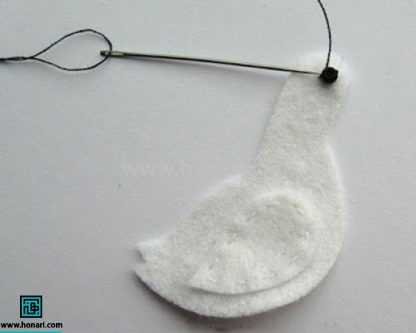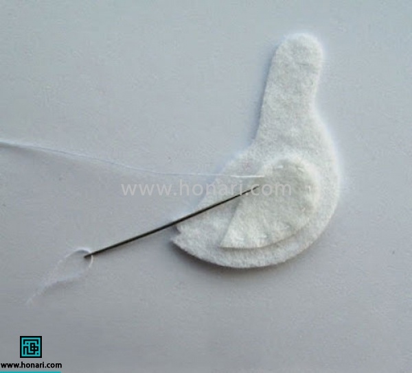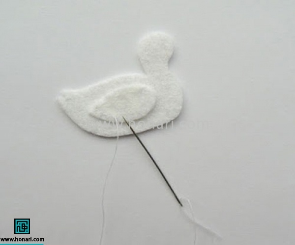 بالهای مرغابی نمدی تونو سر جای خودشون قرار بدین و دور تا دور اونو بدوزین. این کارو برای هر دو طرف بدن مرغابی نمدی تون انجام بدین.