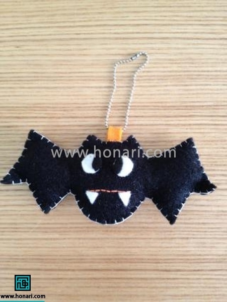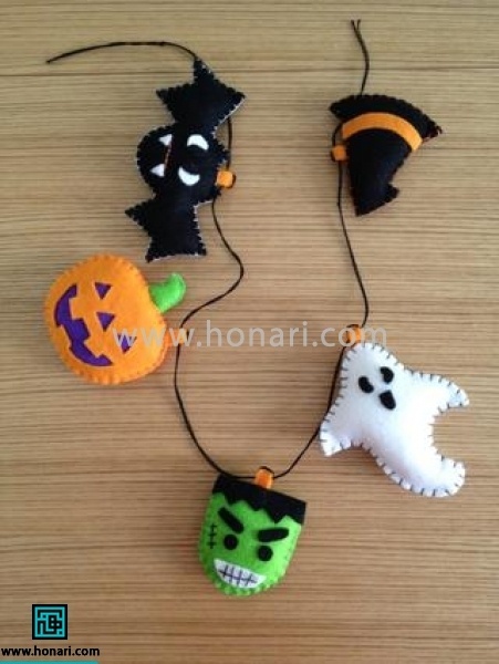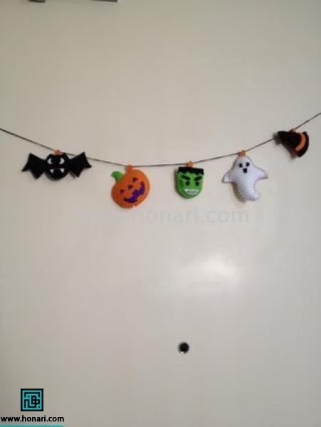 وقتی همه عروسک‌های نمدی هالووین‌مون دوخته شد، از بین قسمت‌های آویز اونا یک نخ، بند یا یک ربان رد کنین و همه رو به شکل ریسه آویزون کنین. همین طور می‌تونین با رشته‌های زنجیر فلزی، بند آویز آماده، نخ یا ربان اونارو تکی آماده کنین و به صورت آویز جاکلیدی، آویز کیف و… استفاده کنین.