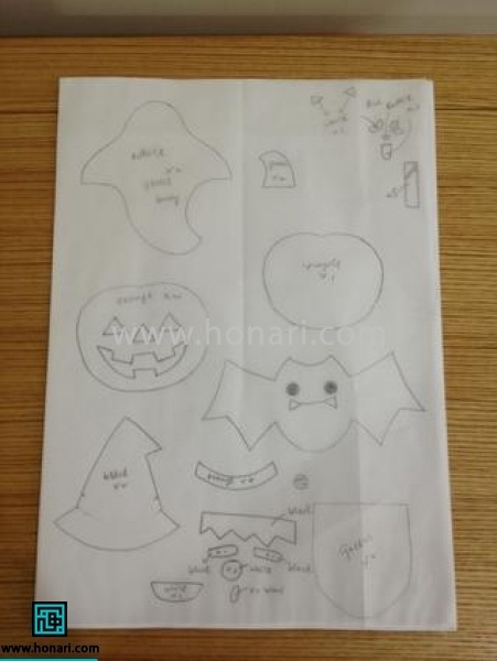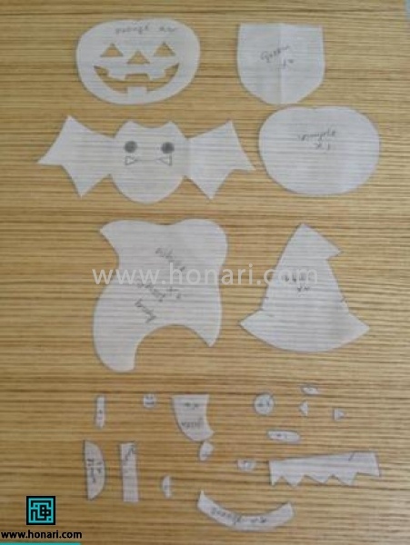 بعد از اون، طرح‌هارو با قیچی برش بزنین و الگوهای عروسک‌های هالووین رو با جزییاتش آماده کنین.