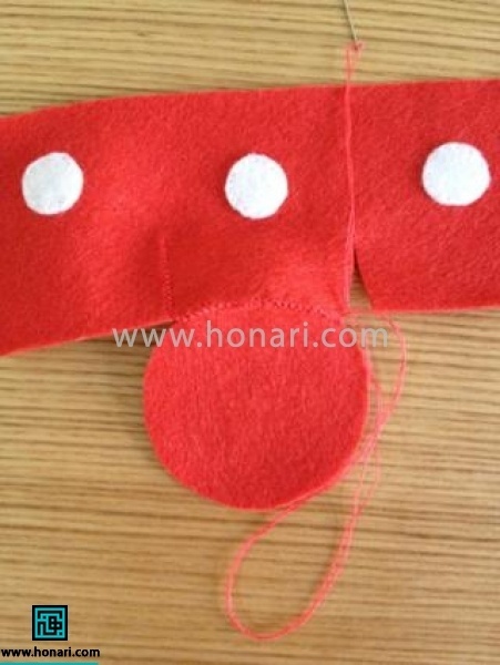 بعد از اون کف گلدان رو به بدنه گلدان نمدی مون دوخت می‌زنیم، و درز عمودی اون رو هم می‌دوزیم.