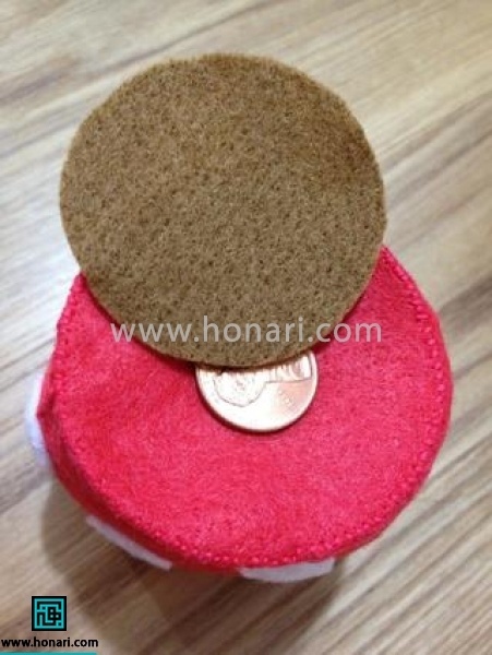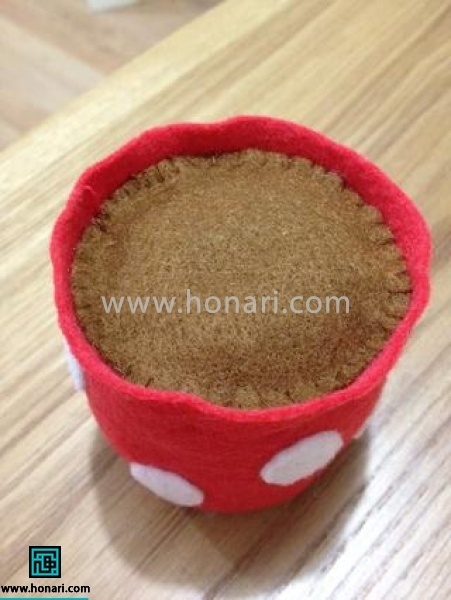 برای نشون دادن خاک داخل گلدان از نمد قهوه‌ای یا خاکی رنگ استفاده می‌کنیم. نمد بریده شده رو روی گلدان می‌ذاریم و به دیواره‌های داخلی اون دوخت می‌زنیم به شکلی که از بیرون گلدان نمدی مون، جای دوخت‌ها مشخص نباشه.