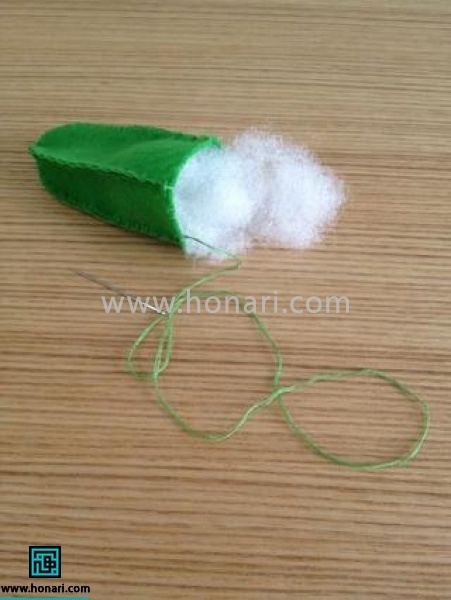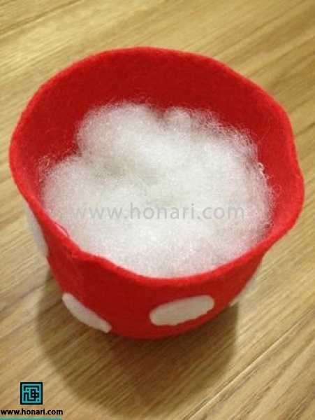 بعد از دوخت گلدان نمدی، داخل اونو با پشم شیشه پر می‌کنیم.