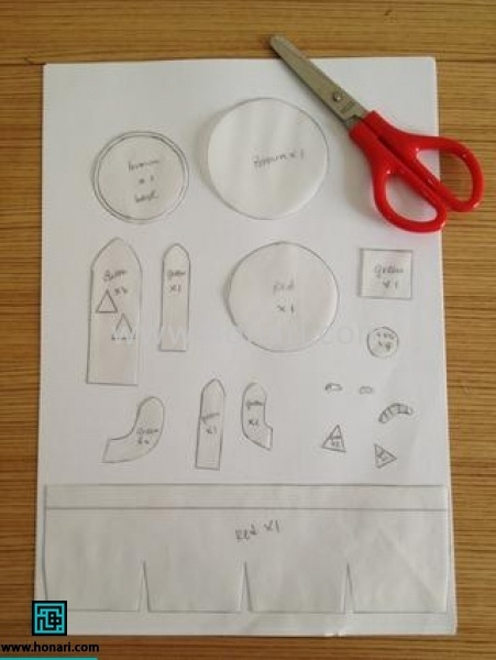 طرح مورد نظر را روی کاغذ یا مقوا می‌کشیم یا پرینت می‌کنیم، سپس اونو برش می‌زنیم تا الگوهای گلدان کاکتوس نمدی مون آماده بشه.