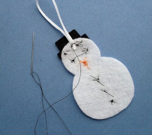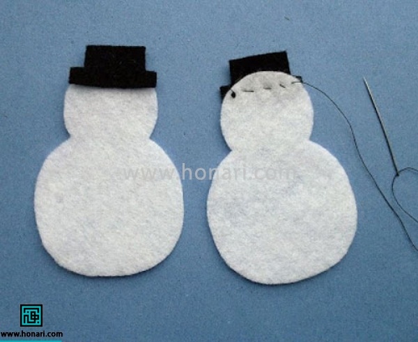 بعد از اتمام مراحل دوخت اجزای رویی آدم برفی نمدی، قسمتهای پشت و جلوی گیفت نمدی رو به هم بدوزین.